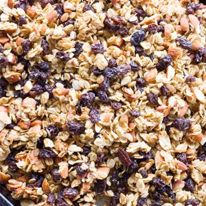 Where do the calories in Raisin Almond Granola come from?